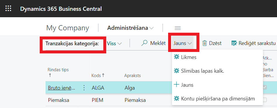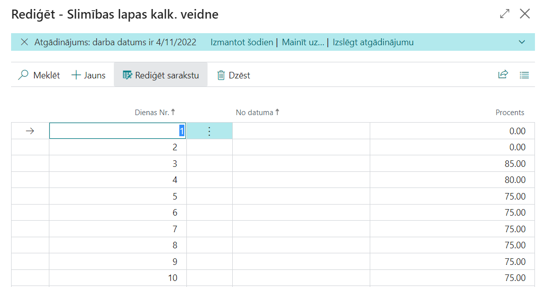 Lai aprēķinātu slimības lapas kompensācijas summu, nepieciešams uzrādīts aprēķina formulu. Aprēķina formula jāievada tabulā «Slimības lapas kalk. veidne», ar uzrādīto termiņu šīs formulas pielietošanā. Lai atvērtu šo tabulu, nospiediet “Uzstādījumi” → “Transakcijas kategorija” → “Slimības lapas kalk.”. Lai uzrādīt formulu konkrētai slimības lapas kompensācijai tabulā “Transakcijas kategorija” novietojiet kursoru vajadzīgajā rindā.