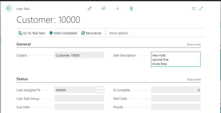 When user open task card, description of note or task is visible. Also, by pressing button “Go To Task Item” user can open list page of source record, where original note was made.