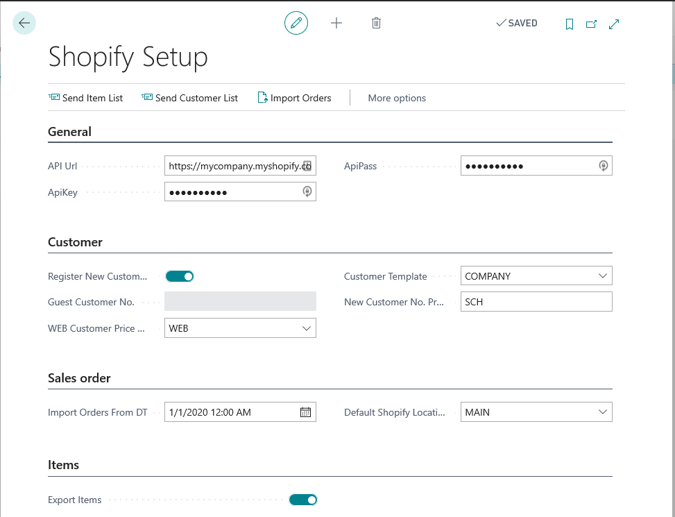 - Export Items = switch-on selector if you want to export Item information (new items, updated items) from system to Shopify. This will need additional setup (see ”Item Export Setup”).